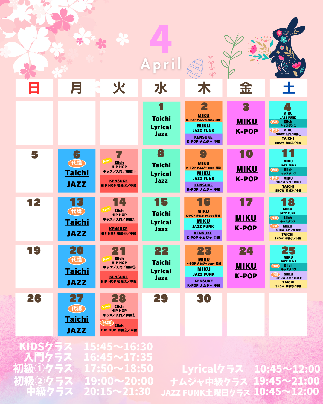 4〜5月のレッスンスケジュールを更新いたします。スケジュールに変更がありますので必ずご確認をお願いいたします。⭐️【月曜日】JAZZクラス 『代講』RYO先生→taichi